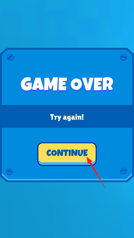 3、游戲結(jié)束啦,屏幕顯示GAME OVER,點(diǎn)擊CONTINUE按鈕,就可以重新開始游戲,再次嘗試挑戰(zhàn),看看這次能不能順利通關(guān)。