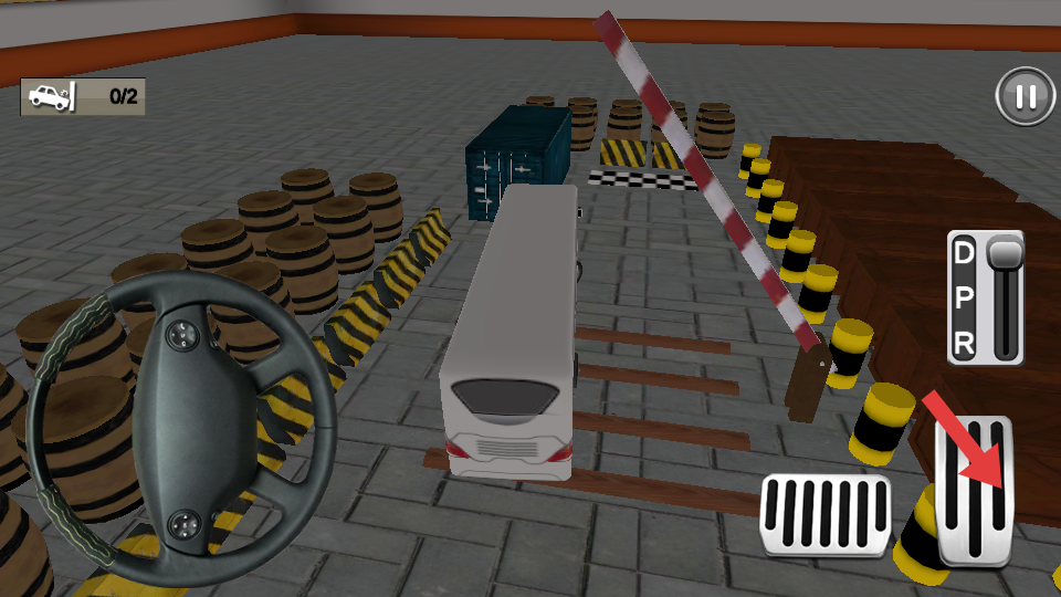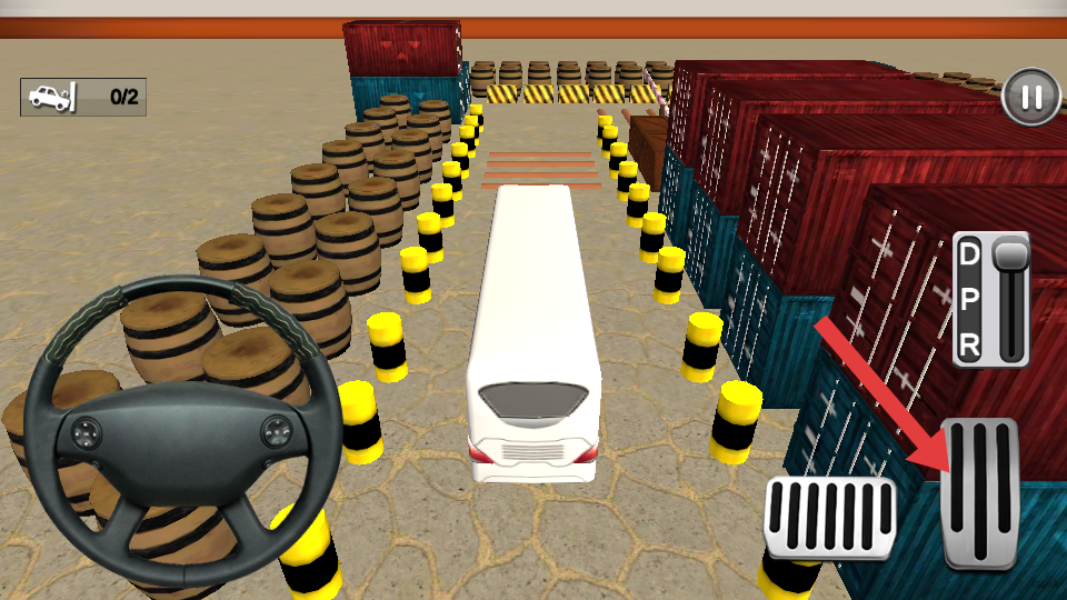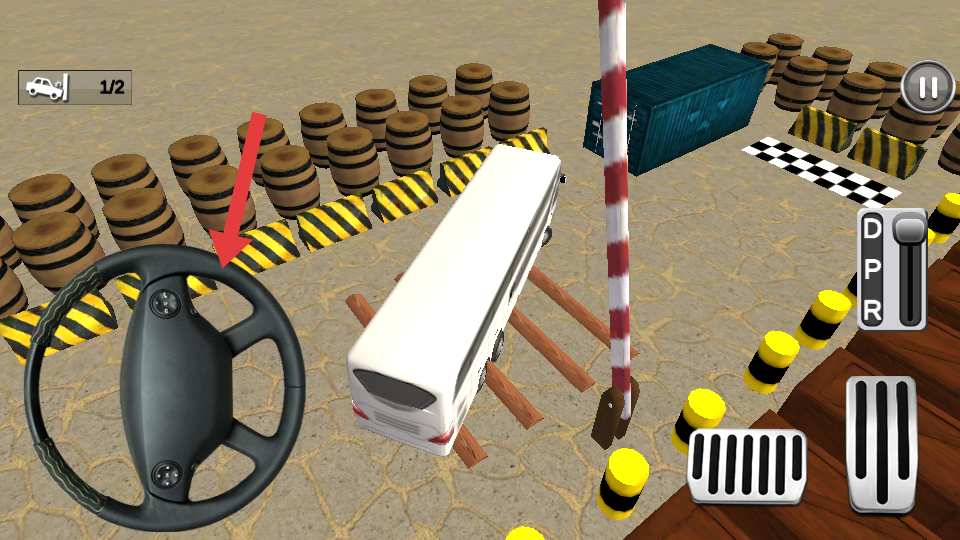 1、進入關(guān)卡,用右側(cè)油門、剎車踏板控制車速,左側(cè)方向盤調(diào)整方向,按箭頭指引,躲避木桶。