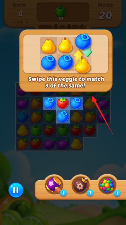 3、按照提示,滑動(dòng)蔬菜,讓三個(gè)相同的蔬菜匹配到一起,這樣就能消除它們,同時(shí)獲得分?jǐn)?shù),朝著收集目標(biāo)前進(jìn),試試這個(gè)滑動(dòng)匹配的操作。
