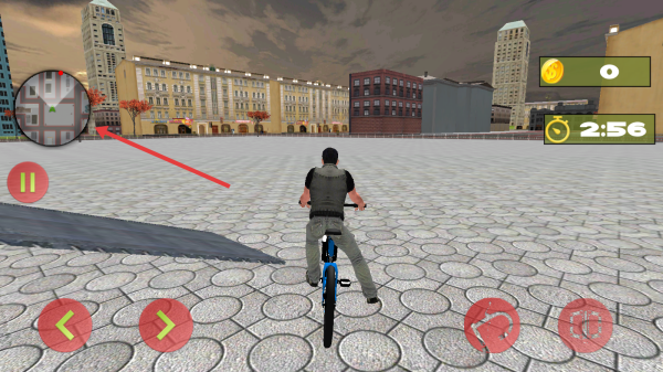 2、進(jìn)入關(guān)卡,操控角色騎自行車,按左上角小地圖指引,在城市街道行駛,避障礙,趕在2:56時(shí)限內(nèi)完成配送。