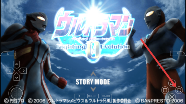1、在奧特曼格斗進化0主界面,按箭頭指引點擊右下角圓形確認按鈕,進入STORY-MODE,開啟劇情模式的角色選擇流程。