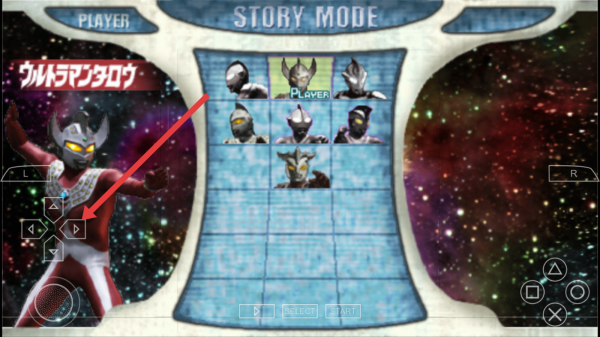 2、進入故事模式選角界面,操控左側方向鍵移動光標,選定泰羅奧特曼,為后續(xù)劇情戰(zhàn)斗與故事推進做好角色準備。