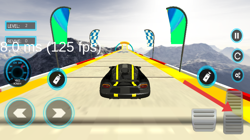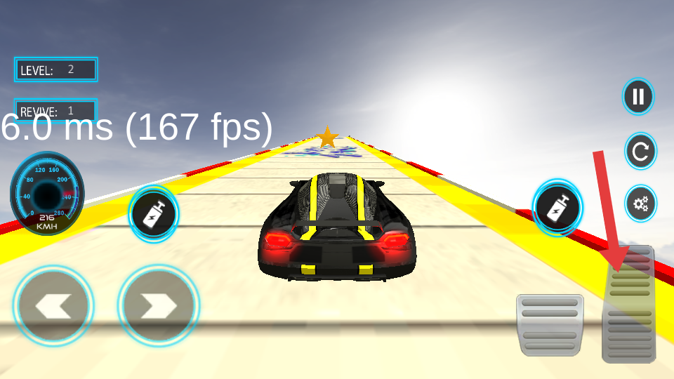 1、進入Level2,操控黑黃賽車,用左下角左右箭頭控方向,長按右側(cè)加速踏板紅箭頭指向,沿坡道加速。