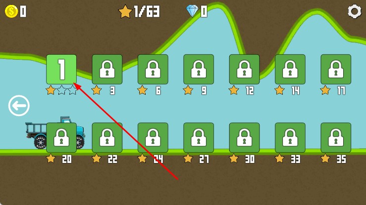 1、進(jìn)入游戲,選藍(lán)色卡車,點(diǎn)擊START開始,選擇關(guān)卡1,在崎嶇地形駕駛。
