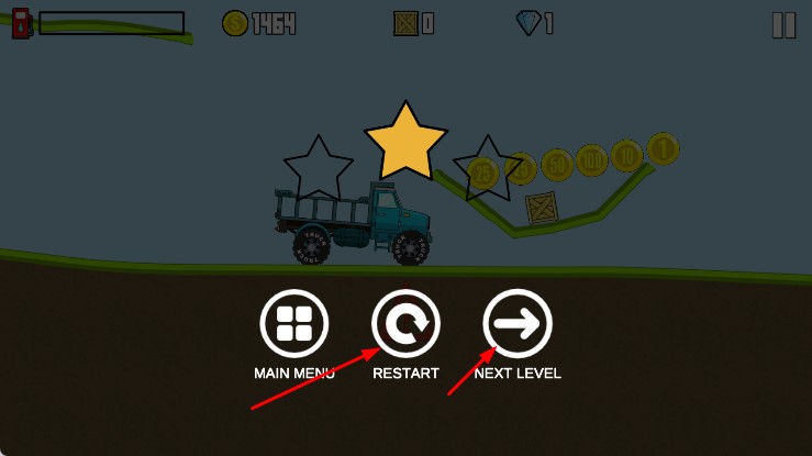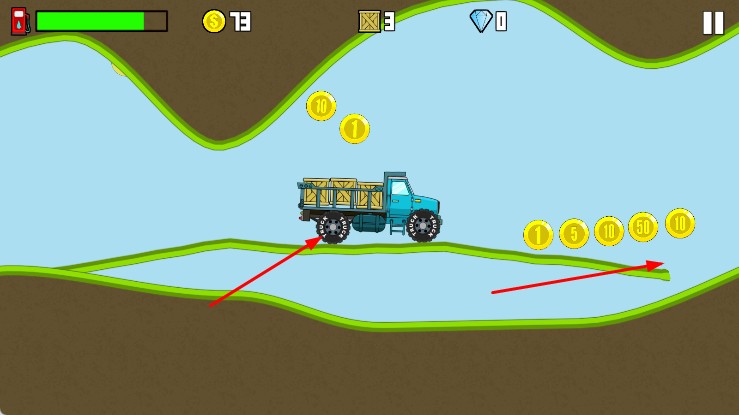 2、操控卡車行駛,收集空中金幣,遇到凹陷地形,需劃線鋪路,讓卡車平穩(wěn)通過(guò),還可拾取油桶保持油量。