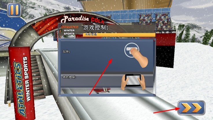 2、選代表國家,查看控制說明,隨后操控雪橇在賽道滑行,躲避障礙、利用加速區(qū),爭取最快速度。