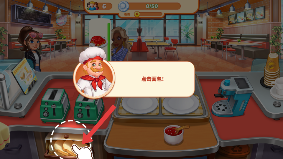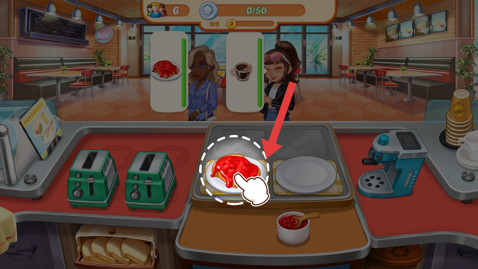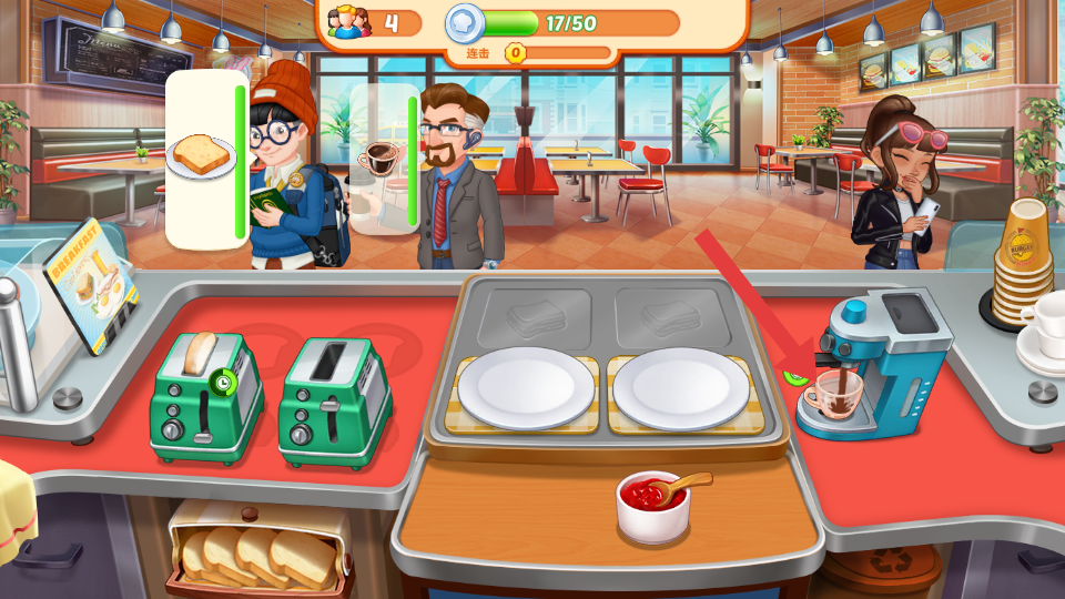 3、留意頂部顧客數(shù)量4人、訂單進(jìn)度,快速響應(yīng)訂單,連續(xù)出餐觸發(fā)連擊,升級(jí)烤面包機(jī)、咖啡機(jī)設(shè)備。