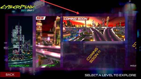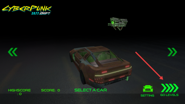 1、在選車界面,確認(rèn)車輛后,點(diǎn)擊GO LEVELS,進(jìn)入關(guān)卡選擇,可選CYBERCITY LAP等賽道。