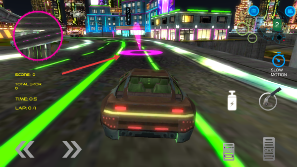 2、選賽道如FREE TOUR,進(jìn)入賽博朋克風(fēng)城市賽道,用左右鍵/虛擬盤控車,沿綠色路線漂移,避障礙。