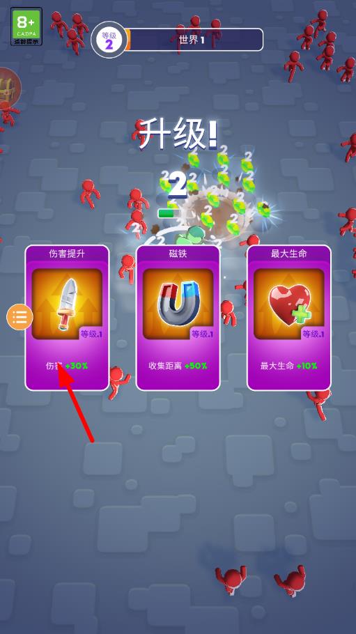 1、英雄技能升級:戰(zhàn)斗中獲取經驗值提升等級,選擇合適的技能進行升級,優(yōu)先強化攻擊范圍與傷害輸出快速提升清場能力應對更多敵人。