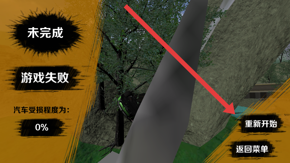 2、若是沒有在規(guī)定時間完成或者從賽道邊緣掉下都算是挑戰(zhàn)失敗,界面顯示未完成,需要點擊重新開始按鈕。