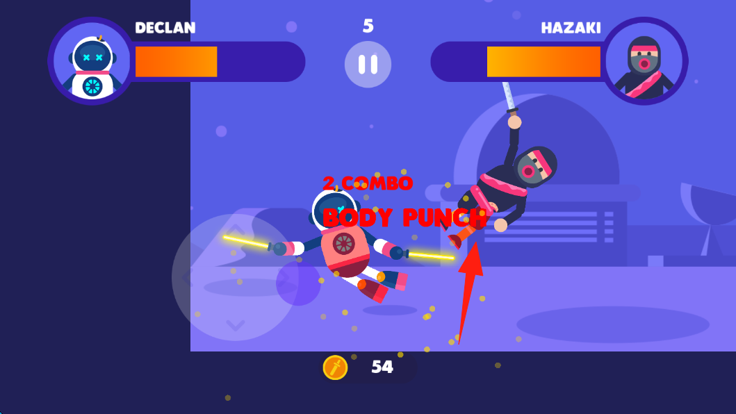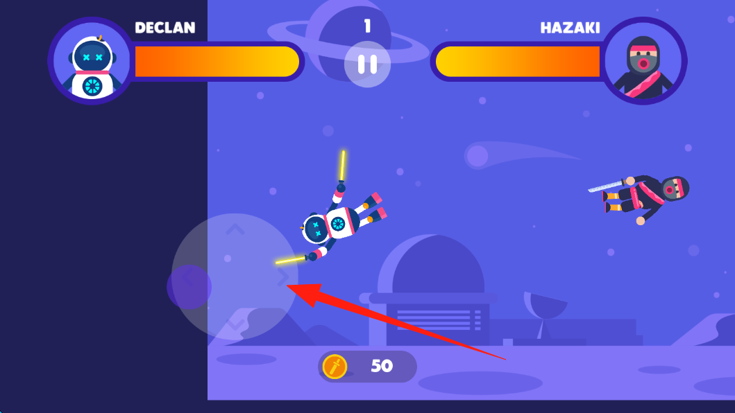 1、操控角色Declan宇航員形象,在太空?qǐng)鼍芭cHazaki忍者形象戰(zhàn)斗,滑動(dòng)屏幕控制移動(dòng)。