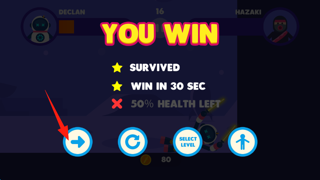 3、勝利后點(diǎn)擊左側(cè)箭頭按鈕,繼續(xù)挑戰(zhàn)下一關(guān),或選擇其他功能按鈕重玩、選關(guān)、換角色。