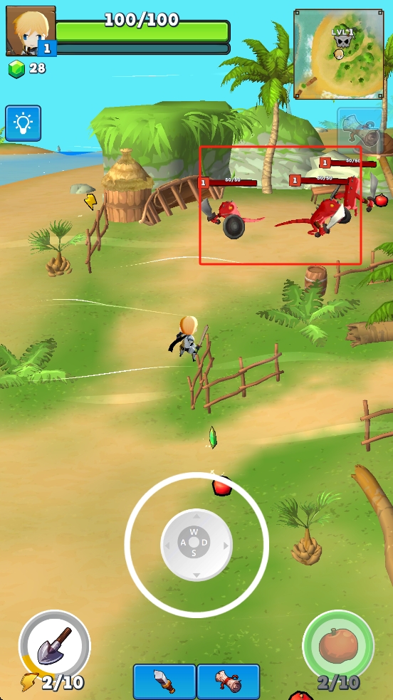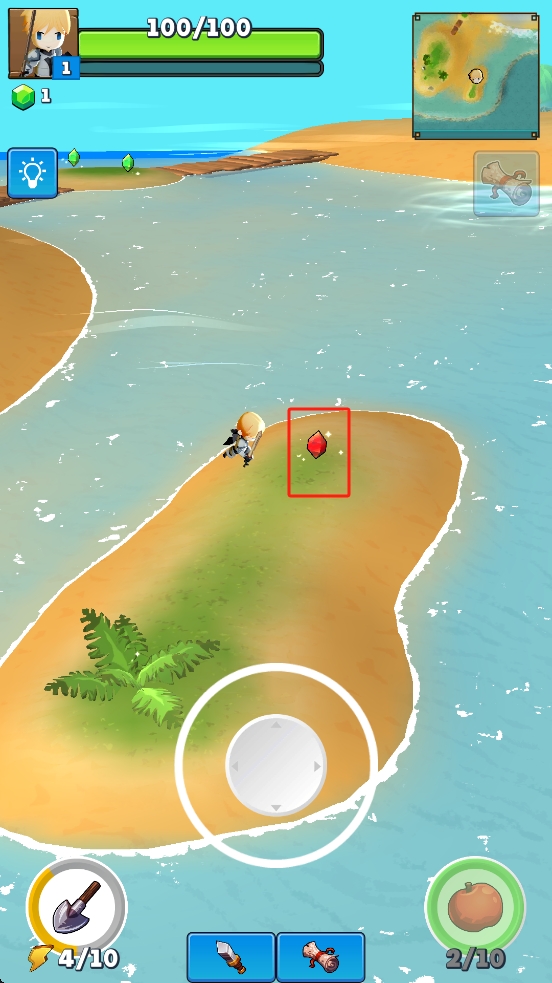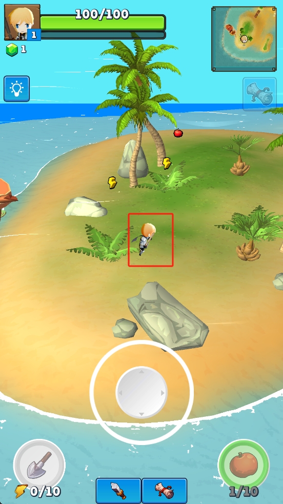 1、操控角色在島嶼移動,留意界面上方血量、道具欄,收集地面黃色問號道具,遇到紅色果實也可采集。