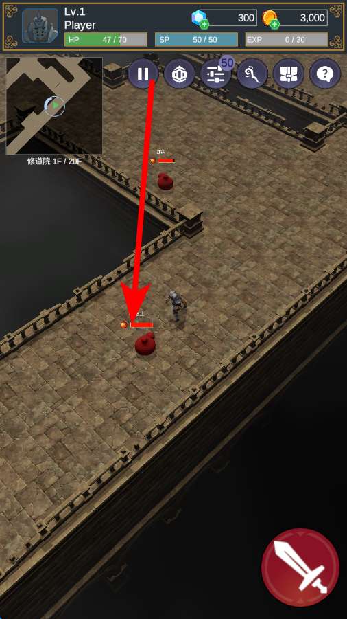 3、進(jìn)入修道院場(chǎng)景后,跟隨指引靠近紅色怪物,利用右下角劍形攻擊按鈕,點(diǎn)擊發(fā)起砍殺,注意觀察怪物血量,合理把控攻擊節(jié)奏,積累戰(zhàn)斗經(jīng)驗(yàn)。