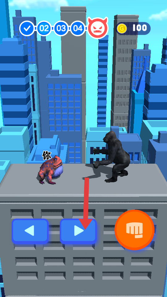 1、第1關(guān)操控蟾蜍,遇大猩猩,用左右箭頭調(diào)整位置,等紅箭頭提示按鍵右箭頭,配合橙色拳頭攻擊。