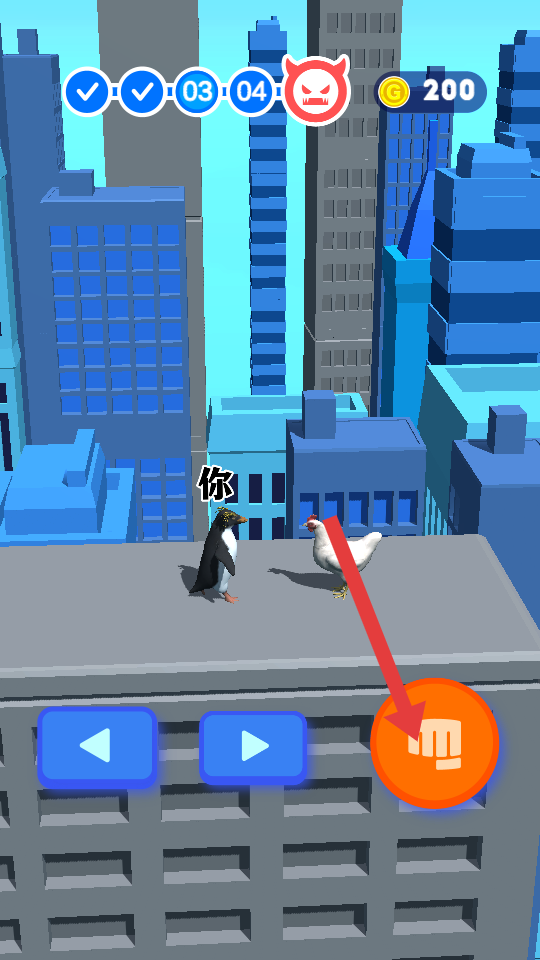 2、第2關(guān)變企鵝對(duì)雞,看紅箭頭提示按拳頭鍵,預(yù)判敵人動(dòng)作,保持連擊,積累了金幣升級(jí)的攻擊。