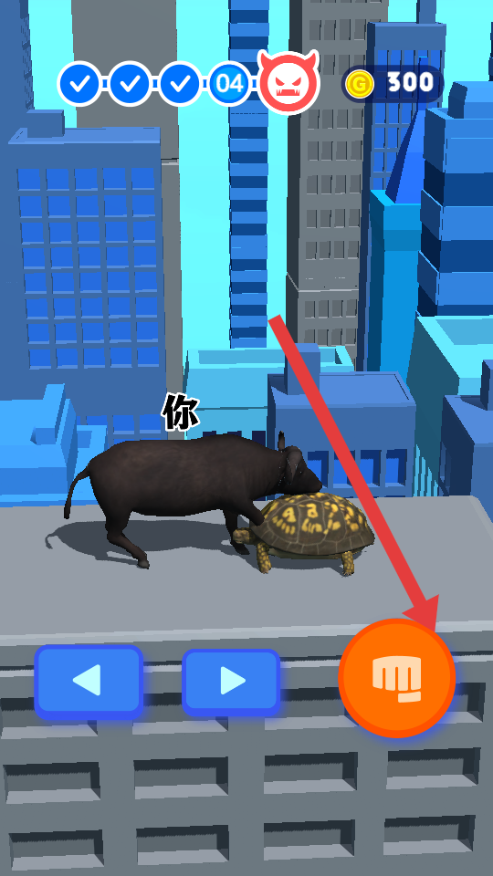 3、第3關(guān)操控牛戰(zhàn)烏龜,利用左右移動(dòng)繞龜殼,紅箭頭指拳頭時(shí)攻擊,關(guān)注其中的進(jìn)度,解鎖新怪獸。