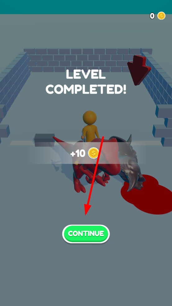 3、擊潰所有入侵怪物后,冰墻進(jìn)度條滿額,畫面彈出LEVEL COMPLETED,點(diǎn)擊CONTINUE領(lǐng)取金幣,解鎖新關(guān)卡與更強(qiáng)恐龍。
