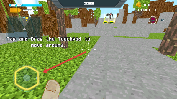 2、根據(jù)Tap and Drag the Touchpad to move around指引,拖動(dòng)虛擬搖桿,控制角色在草地、道路移動(dòng)。