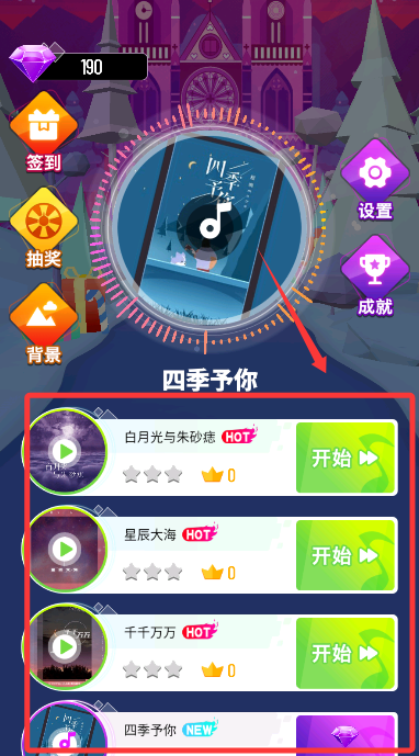 3、在音樂庫中選擇想玩的曲目,比如星辰大海、千千萬萬等熱門歌曲。