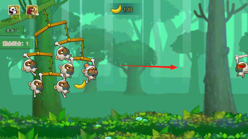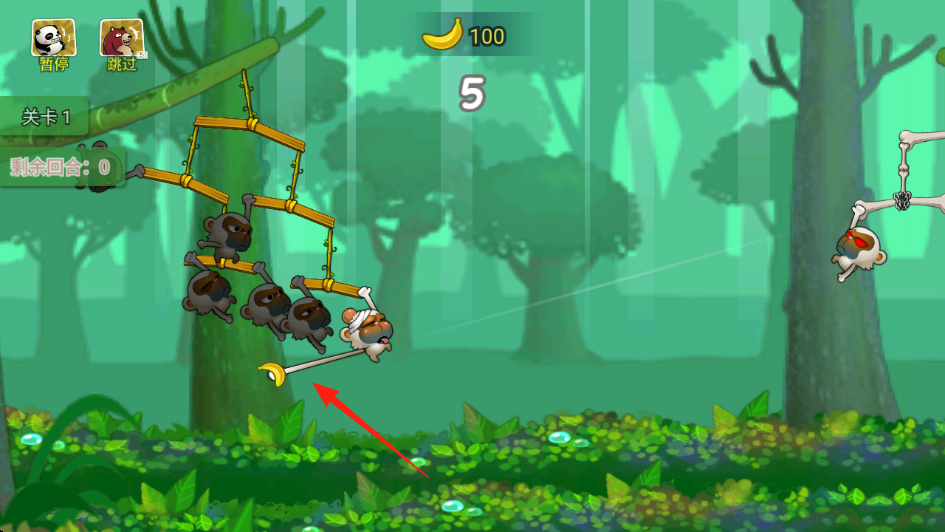 1、觀察猴子陣型,點擊發(fā)射如彈弓機制,讓猴子攻擊右側(cè)敵人,利用香蕉資源100,把握剩余回合如1回合。