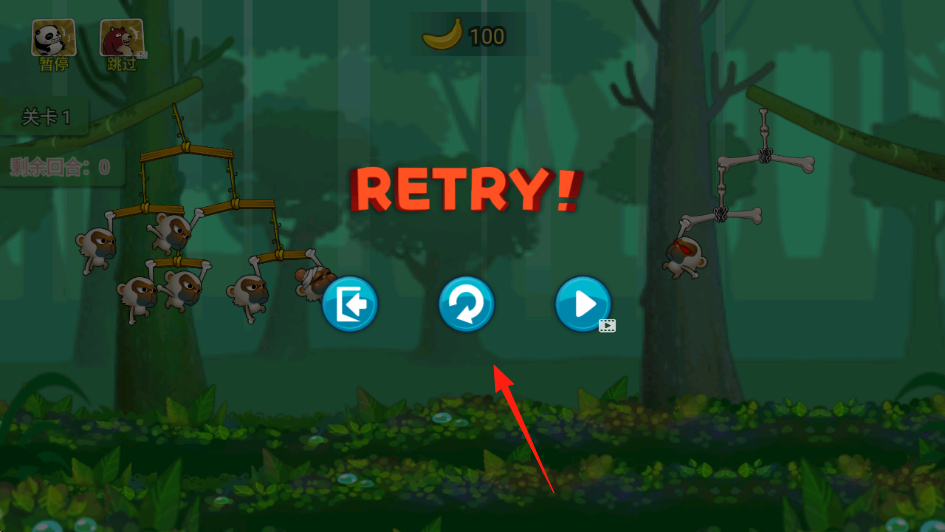 3、點擊中間重置按鈕紅箭頭處,重新挑戰(zhàn)關(guān)卡1,利用彈射機制,調(diào)整猴子發(fā)射,在剩余回合內(nèi)擊敗敵人,消耗香蕉可助力。