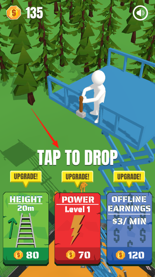 1、點擊【TAPTODROP】讓大錘落下、砸向目標、用金幣升級屬性、砸毀物品積累金幣推進游戲。