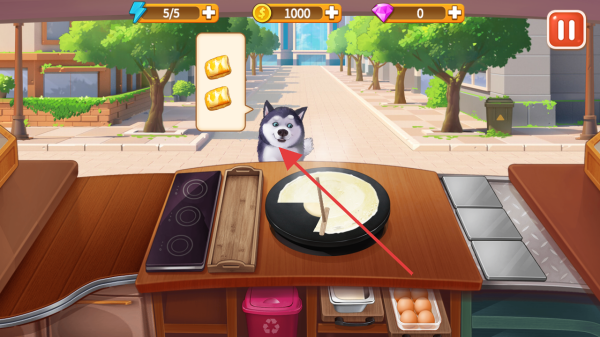 3、在制作臺,按提示如哈士奇需求 ,制作早餐煎餅等 ,滿足顧客,賺取金幣,升級店鋪。