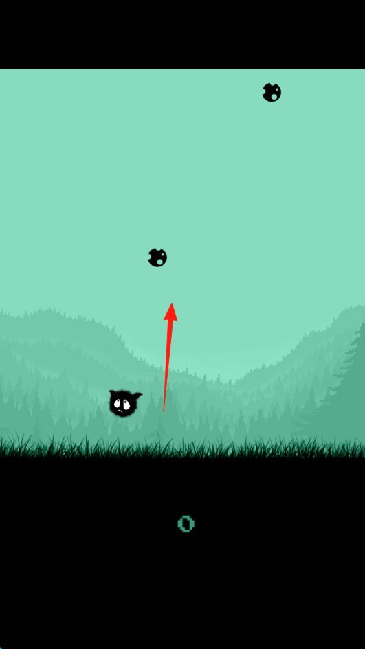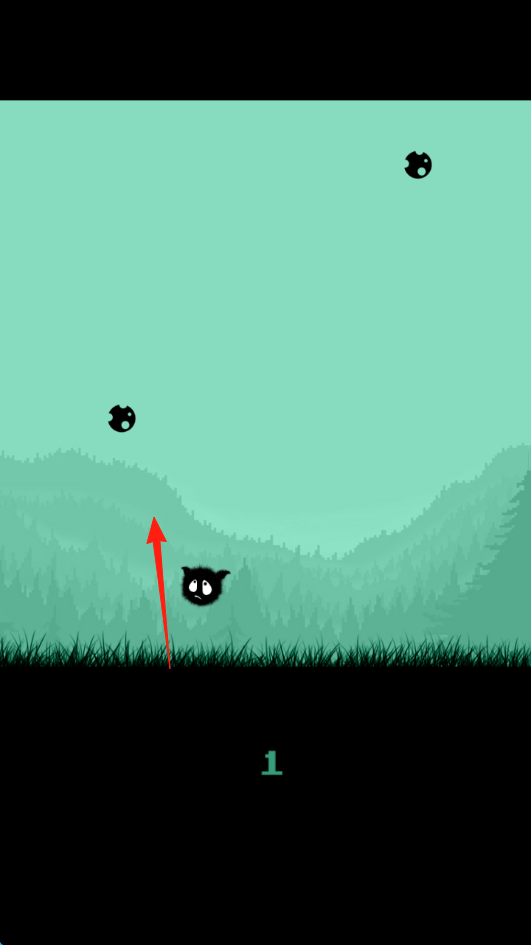 2、點擊屏幕任意位置,操控毛球貓按紅箭頭指示方向跳躍,避開下落的黑色小球障礙,每成功躲避一次,存活時間增加提升。