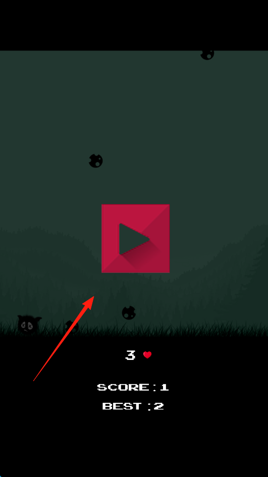 3、若毛球貓被小球擊中,游戲失敗界面顯示3顆愛心、最佳紀錄,點擊紅色播放按鈕,可重新開始游戲,挑戰(zhàn)刷新最佳紀錄。