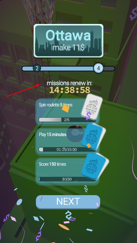 1、調(diào)整籃球投擲軌跡,瞄準籃筐投籃,命中獲取金幣。