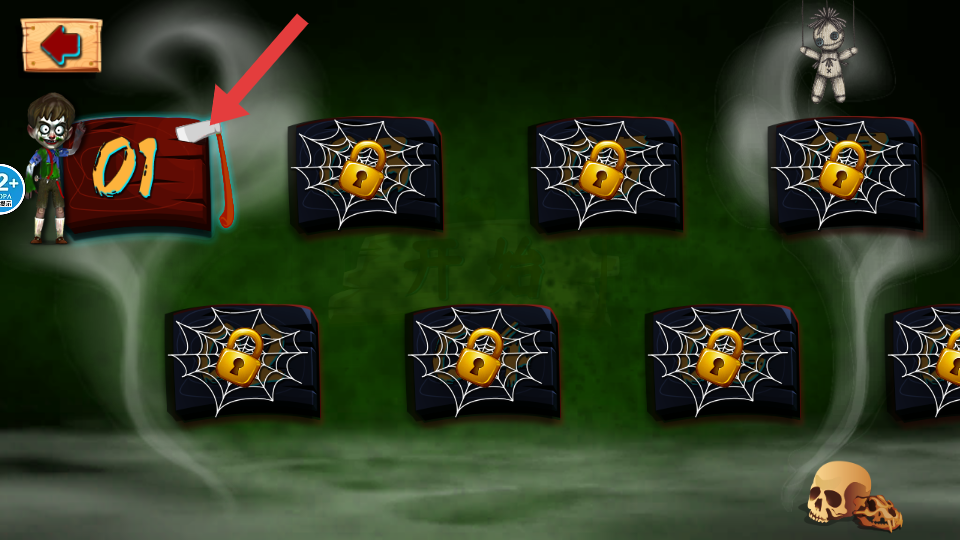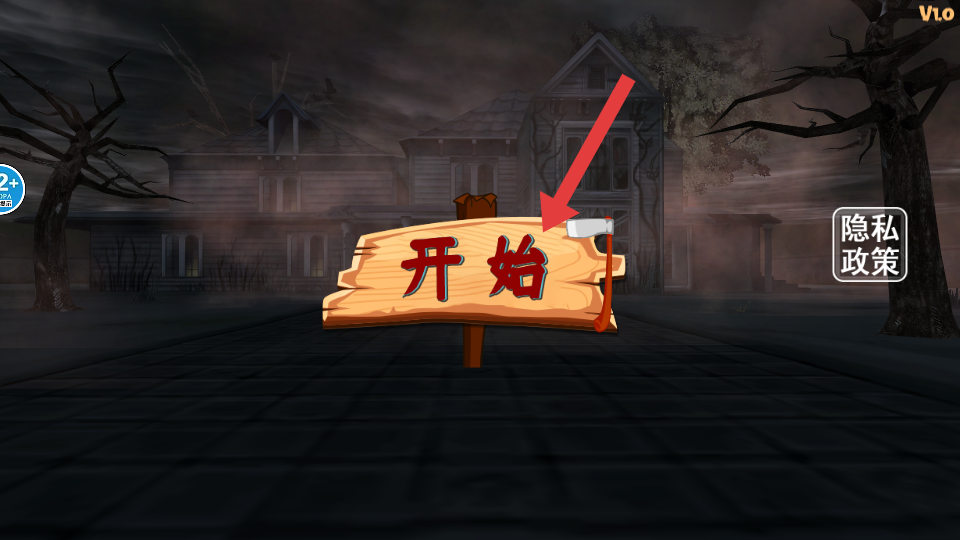 1、進(jìn)入游玩的頁面,點(diǎn)擊屏幕的開始的木牌進(jìn)入選擇的關(guān)卡,開啟了新的恐怖的房屋的冒險(xiǎn)。