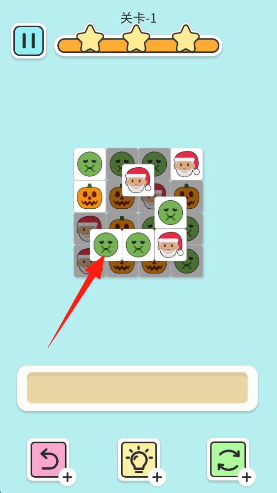 1、在關(guān)卡1,點(diǎn)擊綠色表情方塊,與同類型方塊連線消除,達(dá)成消除目標(biāo),點(diǎn)擊消除相同的方塊。