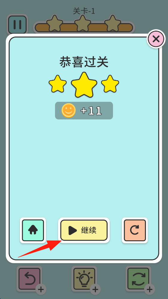 2、成功通關(guān)后,點(diǎn)擊繼續(xù)按鈕,進(jìn)入關(guān)卡2,開啟新消除挑戰(zhàn),點(diǎn)擊按鈕繼續(xù)當(dāng)前的游戲。