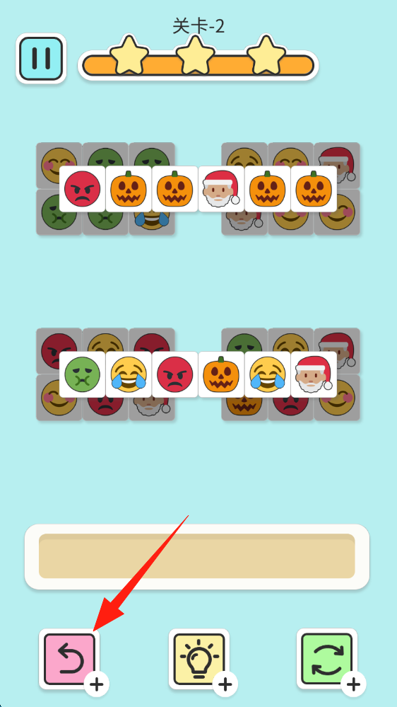 3、關(guān)卡2中,點(diǎn)擊左下角粉色返回箭頭道具,可撤銷上一步操作,助力調(diào)整消除策略,點(diǎn)擊返回。