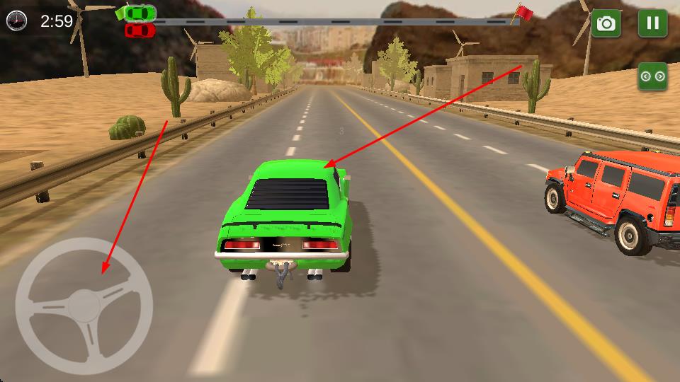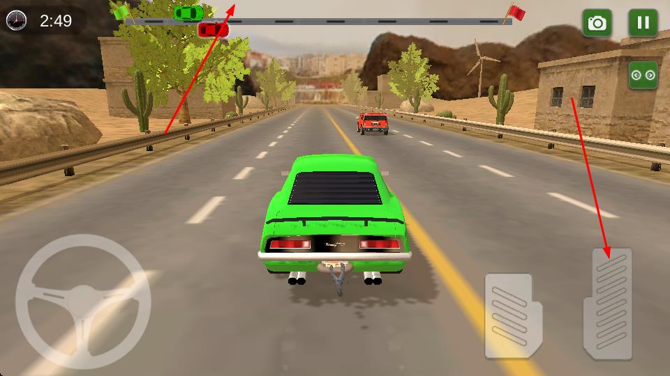1、通過(guò)左側(cè)虛擬方向盤(pán)操控車(chē)輛轉(zhuǎn)向,點(diǎn)擊右側(cè)踏板控制加速,駕駛綠色賽車(chē)在公路開(kāi)啟競(jìng)速之旅。