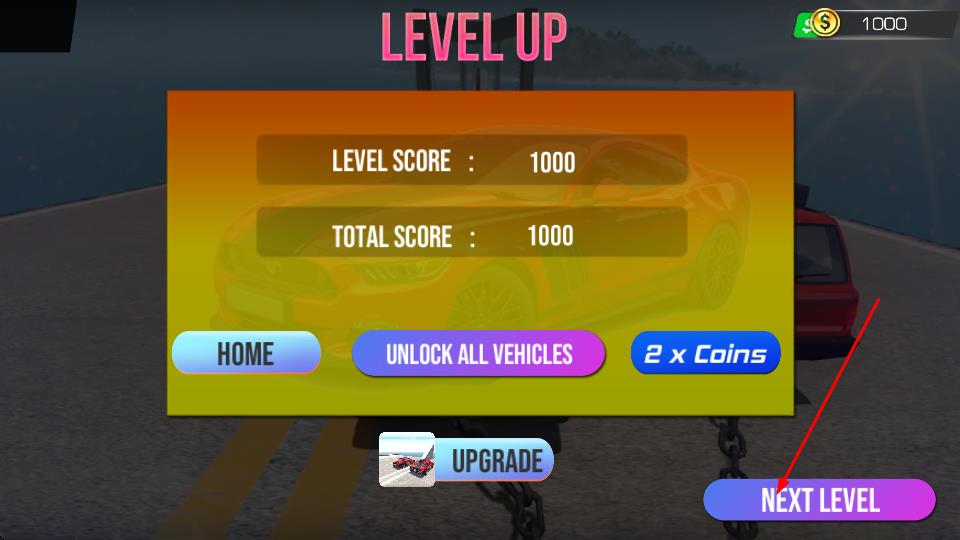 3、通關(guān)以后點(diǎn)擊NEXT LEVEL按鈕進(jìn)入下一關(guān),也可利用金幣解鎖車(chē)輛或升級(jí)性能,提升競(jìng)速能力。