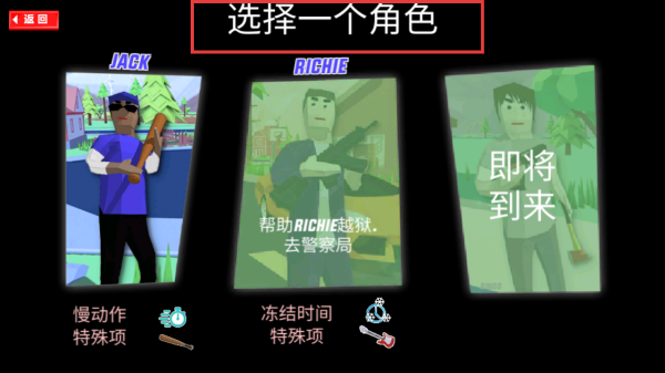 2、進(jìn)入選擇一個(gè)角色界面,可選JACK慢動(dòng)作特殊項(xiàng)、RICHIE凍結(jié)時(shí)間特殊項(xiàng)等,選角色后按其任務(wù)如幫RICHIE越獄推進(jìn)游戲。
