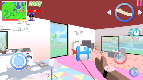 3、選角色進(jìn)入游戲場(chǎng)景后,按界面提示,操控角色在室內(nèi)尋找目標(biāo)物品如藍(lán)色磁盤,利用小地圖、特殊技能慢動(dòng)作等輔助完成收集或任務(wù)。