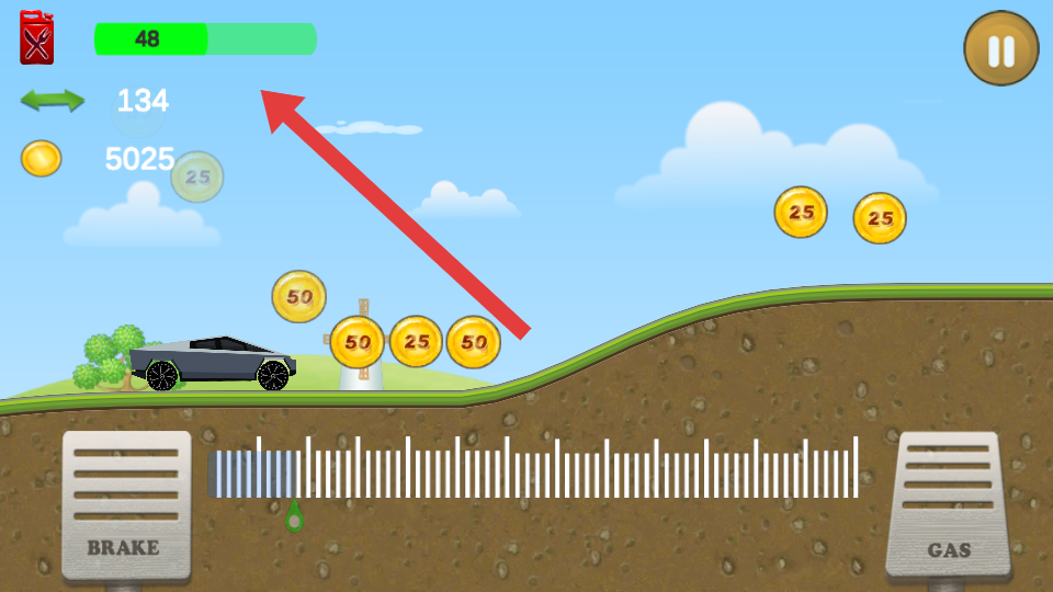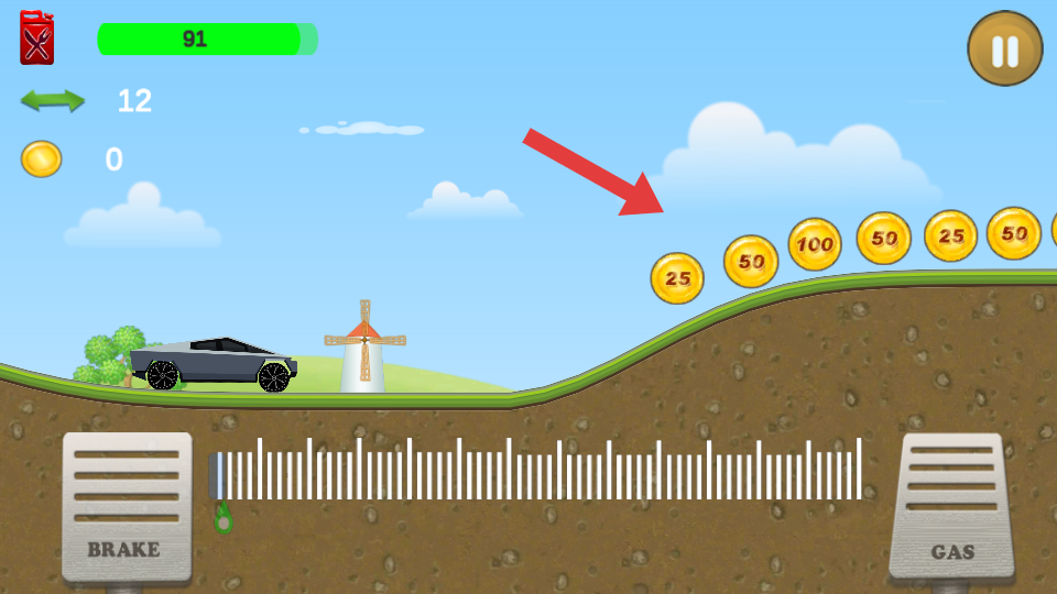 1、起步階段點擊右側GAS踏板加速,驅動車輛爬坡,收集金幣積累資源,注意左側BRAKE用于減速,避免沖坡失控。