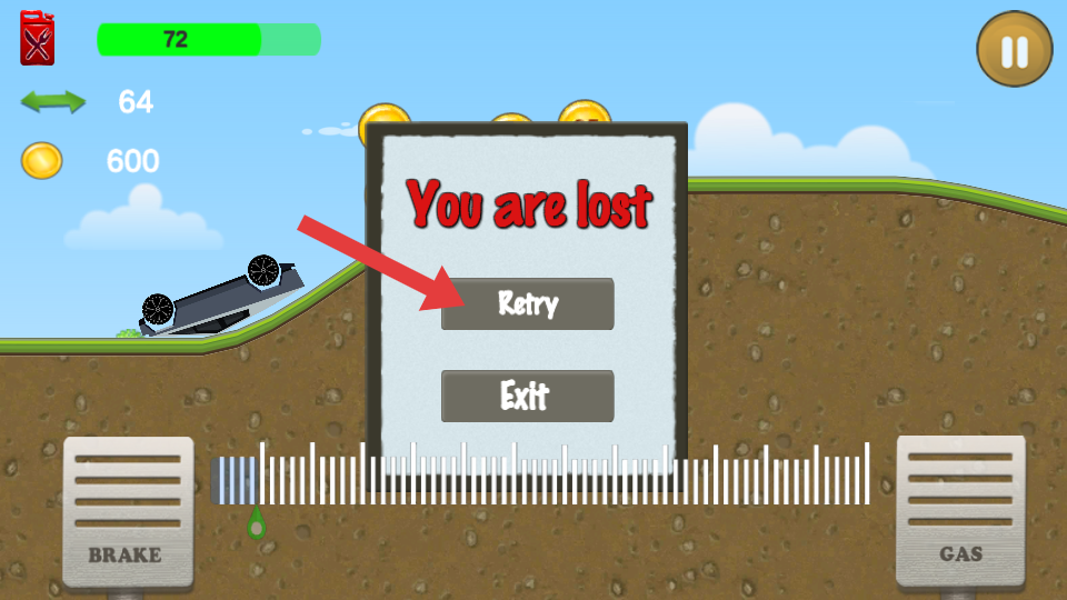 2、若車輛翻車如傾斜過度,觸發(fā)You are lost失敗界面,點擊etry的按鈕,重新開始關卡,調整油門控制,降低翻車風險。