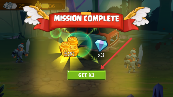 3、任務(wù)完成后,按照箭頭指示,點擊綠色GET-X3按鈕,獲取520金幣與3顆鉆石的三倍獎勵。