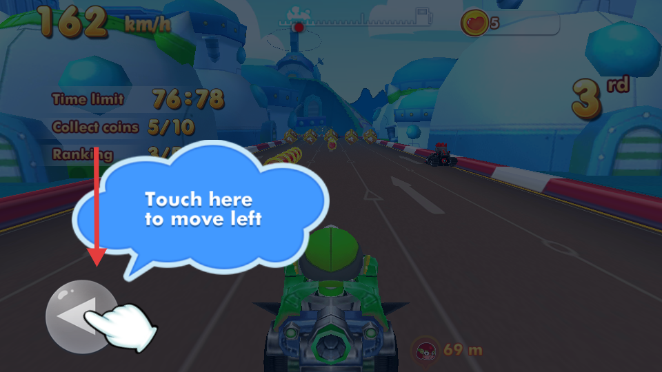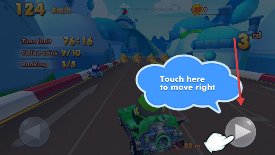 1、基礎(chǔ)操控:通過(guò)重力感應(yīng)控制方向,點(diǎn)擊右側(cè)噴射按鈕觸發(fā)氮?dú)饧铀?,左?cè)剎車(chē)按鈕實(shí)現(xiàn)急轉(zhuǎn)調(diào)頭等基礎(chǔ)操作。