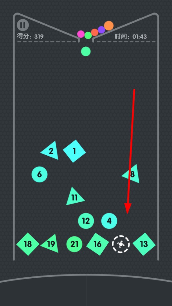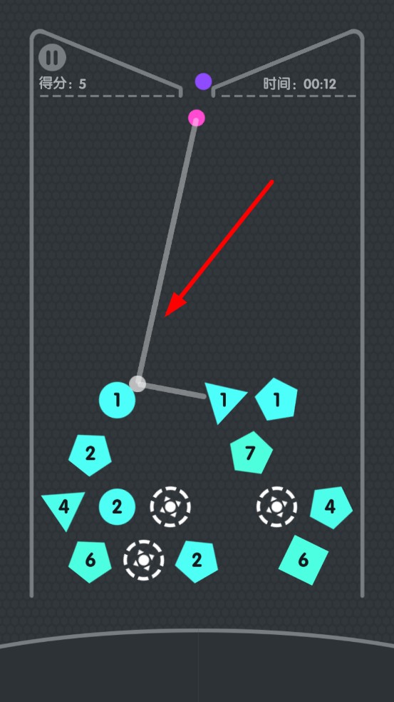 1、角度計(jì)算策略:發(fā)射前預(yù)判彈球反彈路徑,優(yōu)先攻擊密集高分區(qū),利用場景邊緣反彈制造繞場連擊,避開直接掉落區(qū),規(guī)劃軌跡,延長彈射壽命。