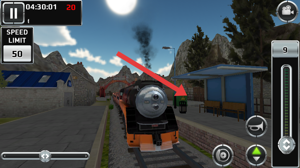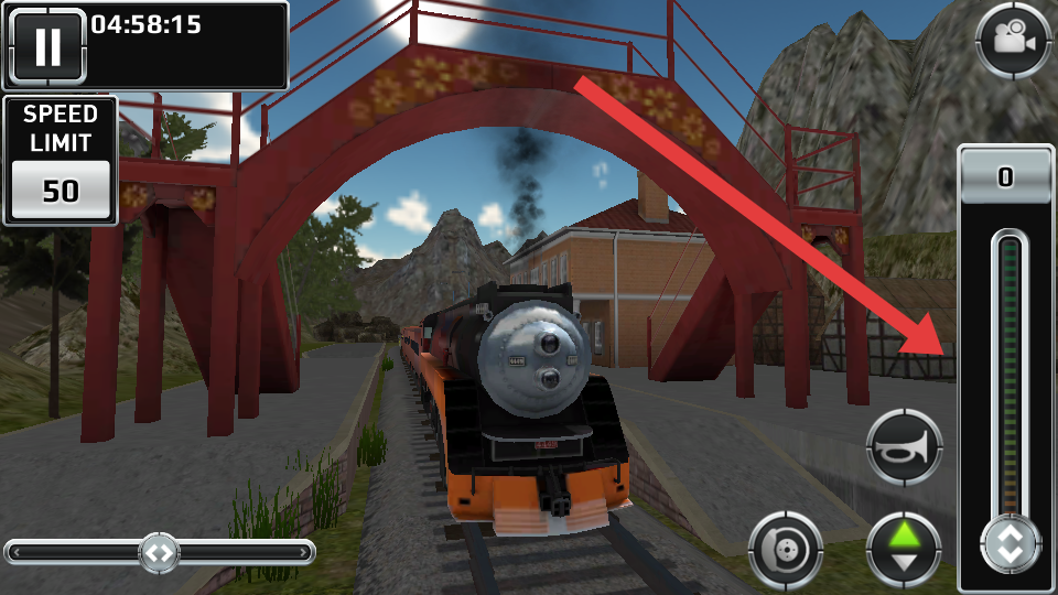 2、進入駕駛界面后,關注左側顯示的SPEED LIMIT50限速提示,借助右側的速度調節(jié)條調控火車行駛速度,確保不超過限速。