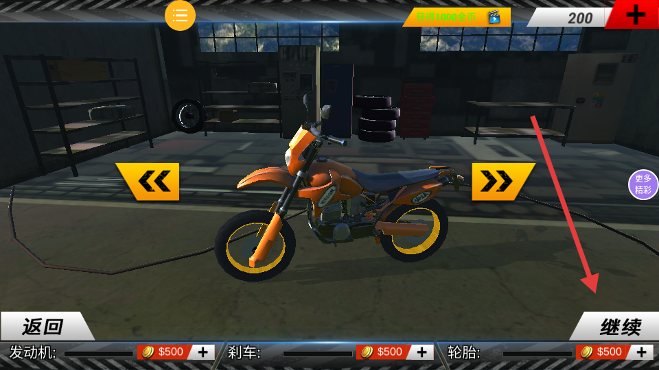 3、收集賽道金幣解鎖哈雷、杜卡迪等12種頂級(jí)摩托車(chē)。