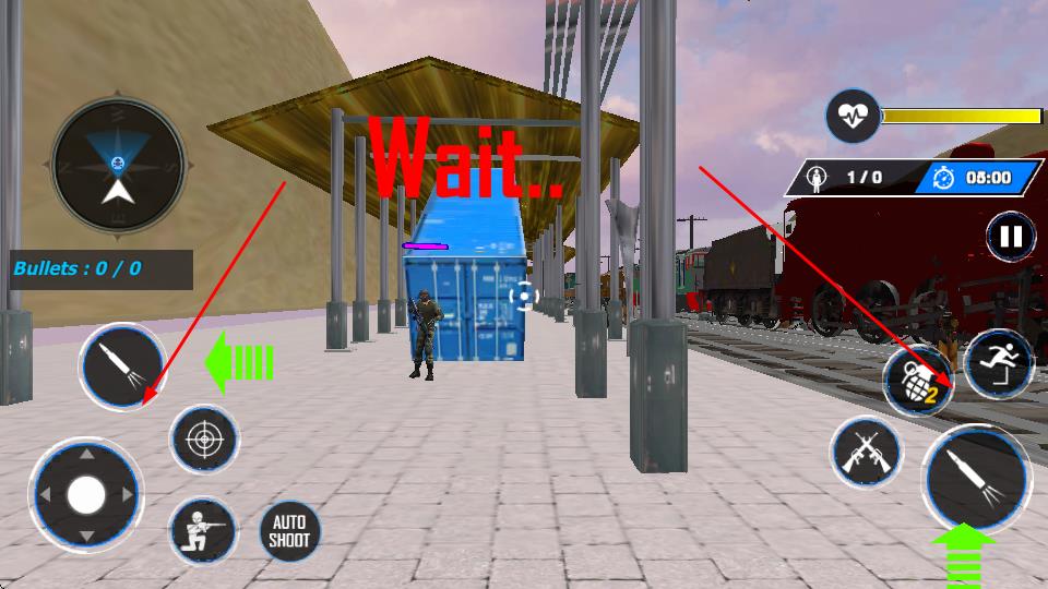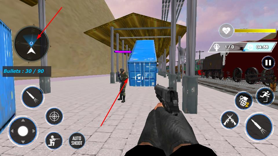 2、用左側(cè)虛擬搖桿移動(dòng),依左上角指南針尋敵操作導(dǎo)彈、瞄準(zhǔn)、自動(dòng)射擊鍵,配合右側(cè)手雷、武器切換,在火車(chē)站場(chǎng)景對(duì)抗敵人。