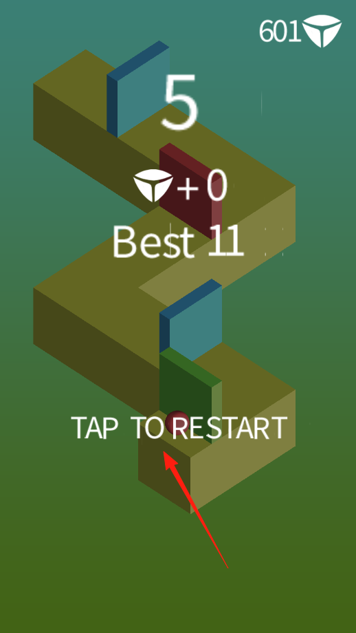 3、如果游戲失敗,屏幕上會顯示TAP TO RESTART,點擊屏幕,就能重新開始游戲,再次操控小球在路徑上移動,避開方塊,爭取這一次能獲得更好的成績。