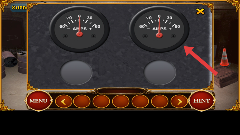 1、觀察兩個標有AMPS的儀表,其指針均指向0,這是電力謎題的初始狀態(tài),需要后續(xù)調(diào)節(jié)數(shù)值以推動機關解鎖。